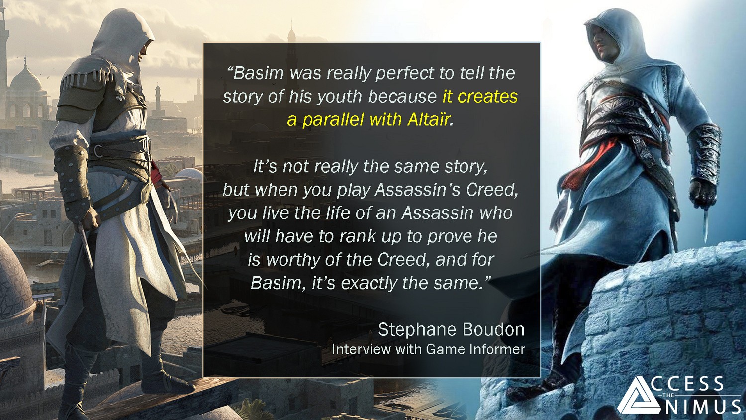 世界任务总监Simone Arseneault表示,他对以巴辛姆为主角的“刺客幻想”特别感兴趣。他指出《奥德赛》卡珊德拉涉及希腊半神的幻想,《英灵殿》艾沃尔反映了维京海盗的幻想,《起源》巴耶克是关于古埃及的幻想。而巴辛姆则回归了《刺客信条》经典幻想:致命的沉默刺客。