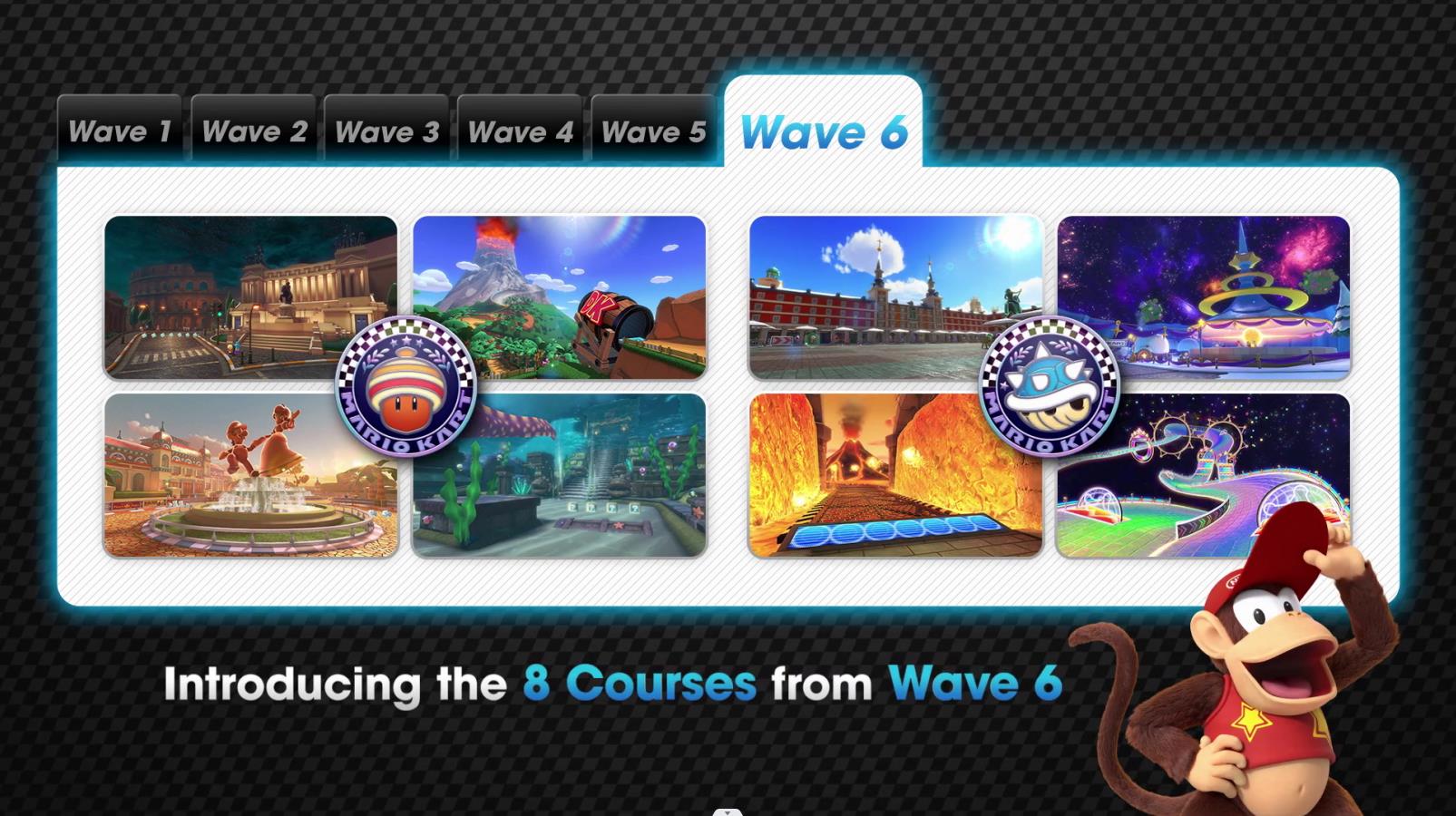作为《马里奥赛车8豪华版》最后的DLC内容,第6弹包含了来自《马里奥赛车Wii》的彩虹大道(Rainbow Road )等7张经典地图,以及一张全新的地图——食人花山谷(Pirahna Plant Cove)。