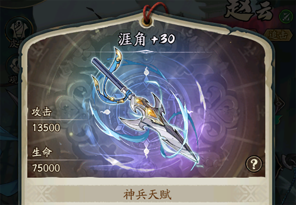 赵云手中的涯角枪,不仅是他的武器,更是他力量的源泉。当“涯角枪魂”的神兵天赋将被激活。此天赋不仅为赵云提供了强大的攻击力加成,还通过不同程度的强化来增益他的各种能力。大幅度提升暴击伤害,“涯角”让赵云在战场上更加无懈可击、所向披靡。赵云,这位蜀国的无双猛将,以其超凡的武艺、坚定的信念和卓越的战斗智慧,成为了后世敬仰的英雄。他的名字将永远镌刻在历史的丰碑上,激励着一代又一代人勇往直前、追求胜利与荣耀。