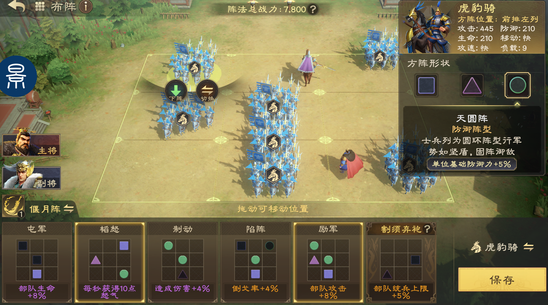 我们可以拖动方阵,调整士兵的位置,也可以调整武将位置。