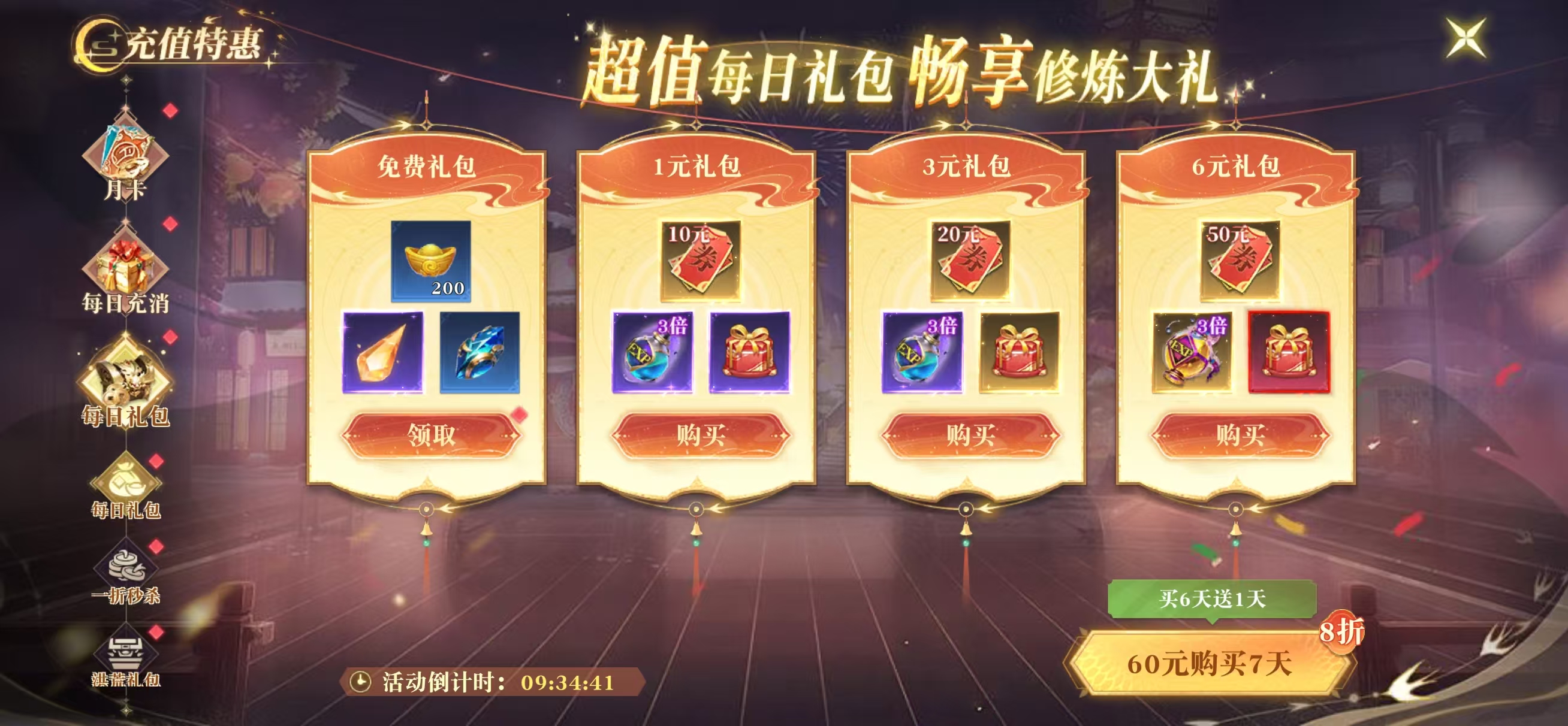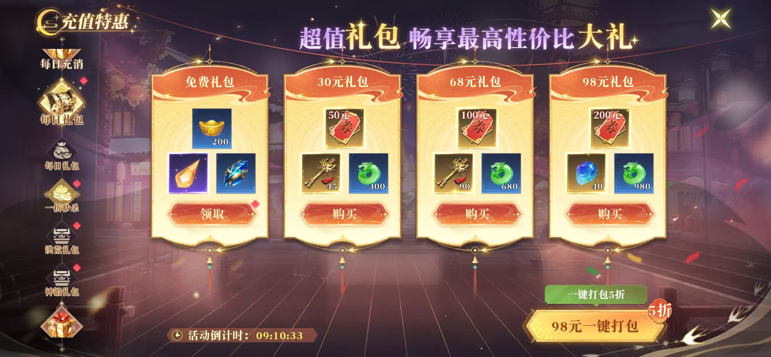 3倍充值宝券返还,双倍灵玉返还,小额充值必备礼包,一键打包可享5折优惠。