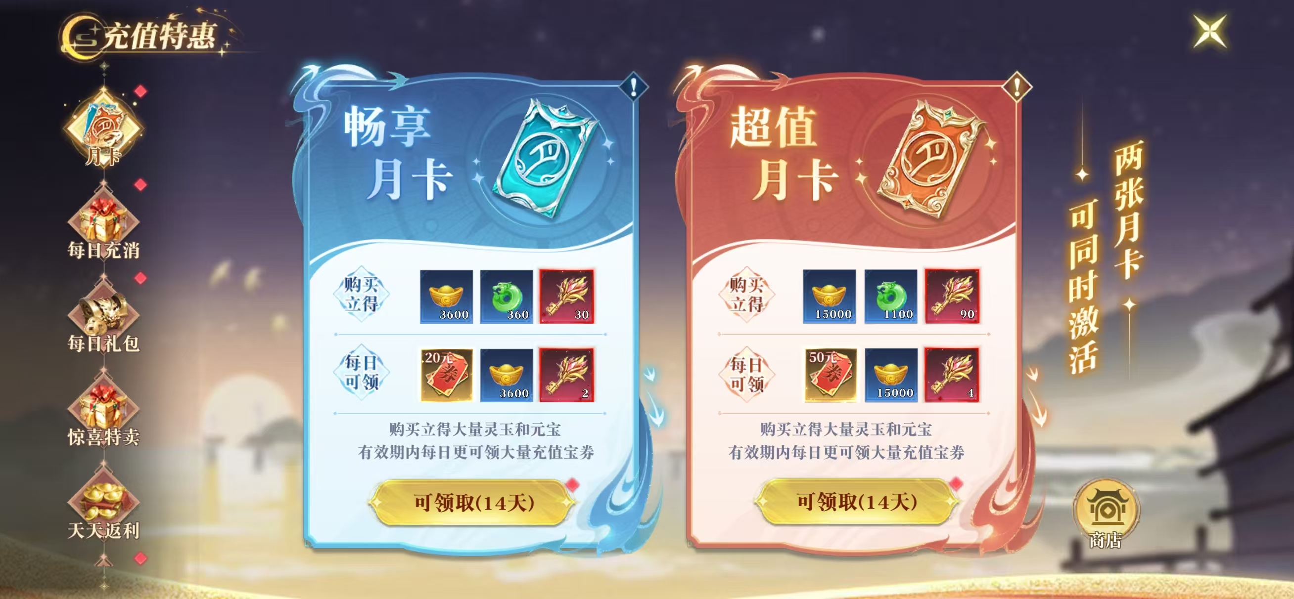 一次购买,长期领奖励,性价比极高,购买立得大量灵玉和元宝,有效期内每日更可领取大量充值宝券。