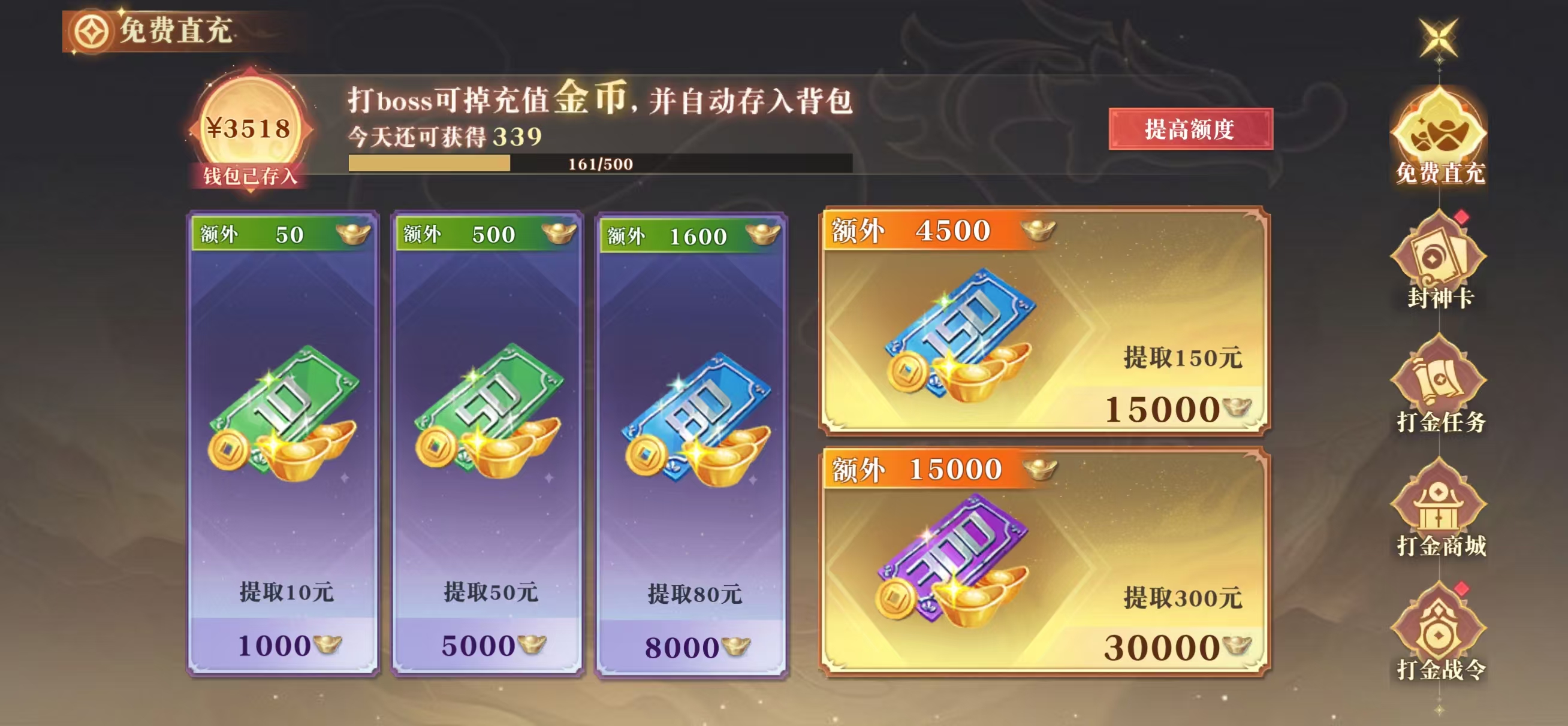 通过打BOSS掉落充值金币,并自动存入背包,充值金币可在【免费直充】商城提取免费充值额度,还可额外获得元宝。