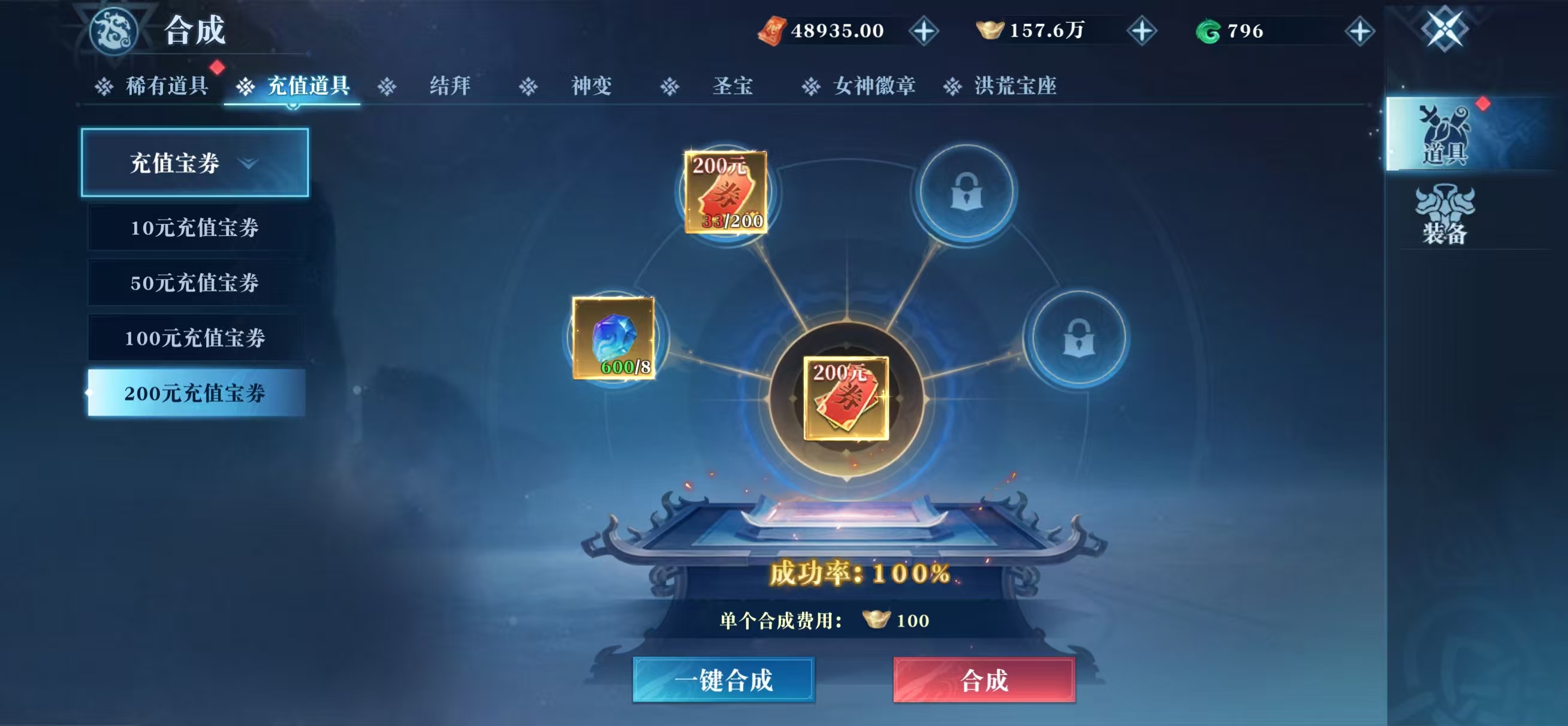 使用宝券碎片与万能水晶可直接合成宝券,成功率100%