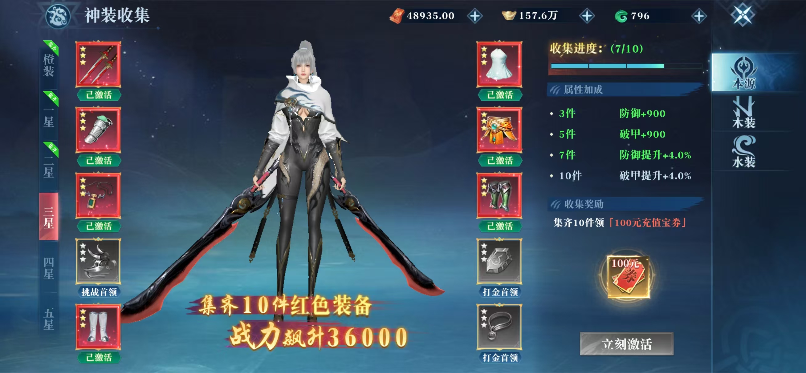 收集神装,激活可得大量宝券,集齐10件红色装备,战力飙升36000。