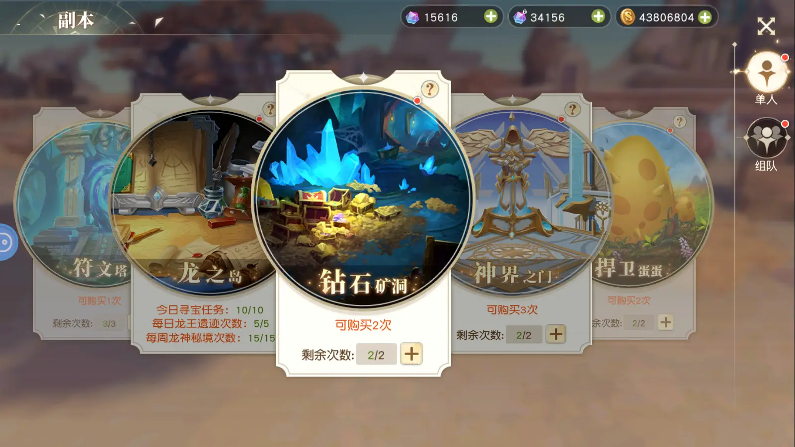 单人副本有:钻石矿洞、天神副本、宠物副本、符文塔、龙之岛。