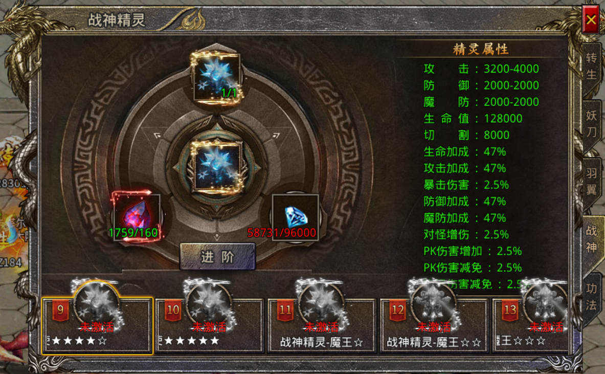 战神精灵可提升多达14项属性,分别为攻击、防御、魔防、生命值、切割、生命加成、攻击加成、暴击伤害、防御加成、魔防加成、对怪增伤、PK伤害增加、PK伤害减免、物理伤害减免。